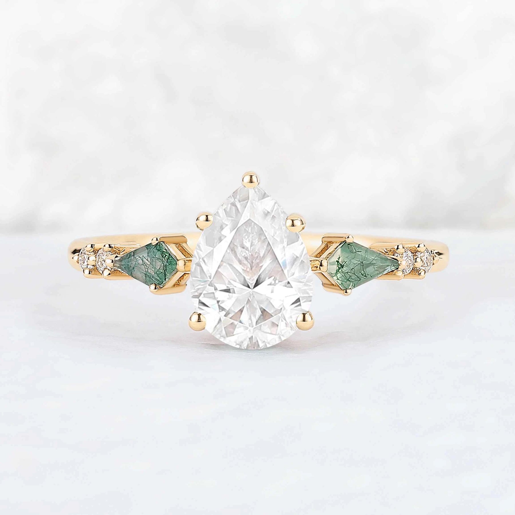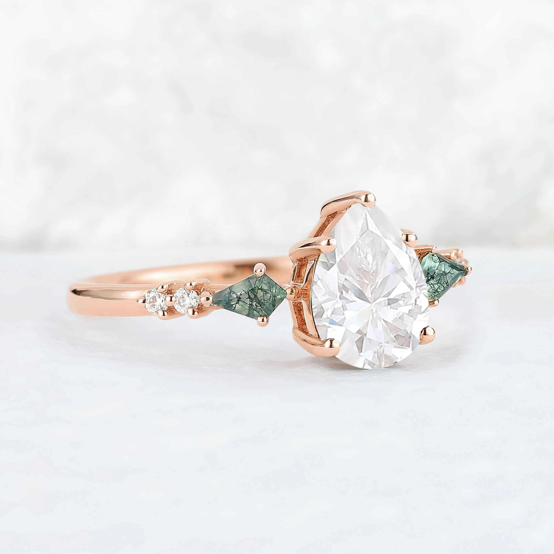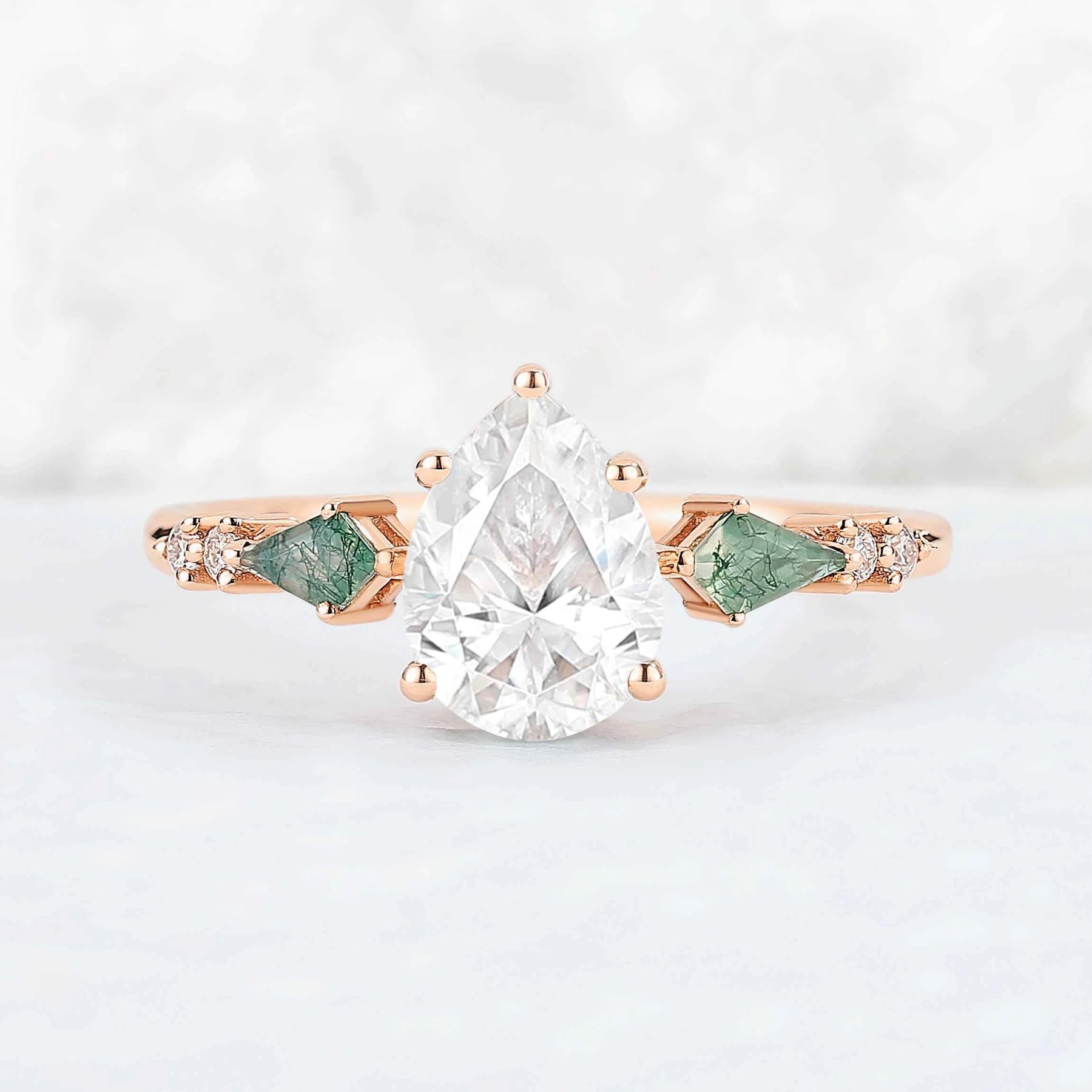 This ring features a stunning pear-shaped moissanite stone in 10k rose gold. Round cut moissanite and kite moss agate stone add a touch of sparkle to this one-of-a-kind ring, making it the perfect choice for the stylish and discerning bride.