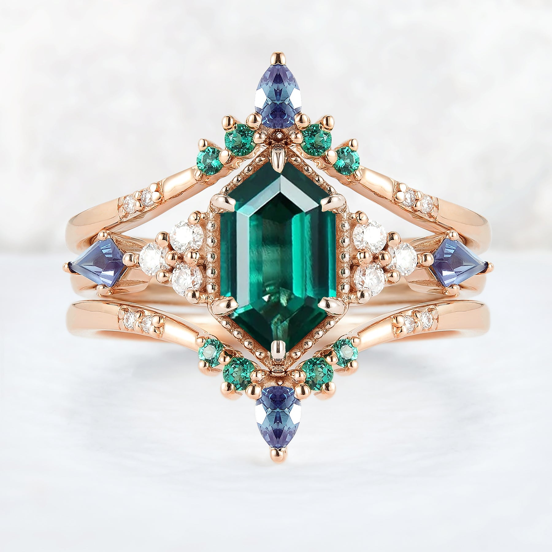 Unique Celtic Hexagon Cut Emerald Enhancer Gemstone Ring Set 2pcs