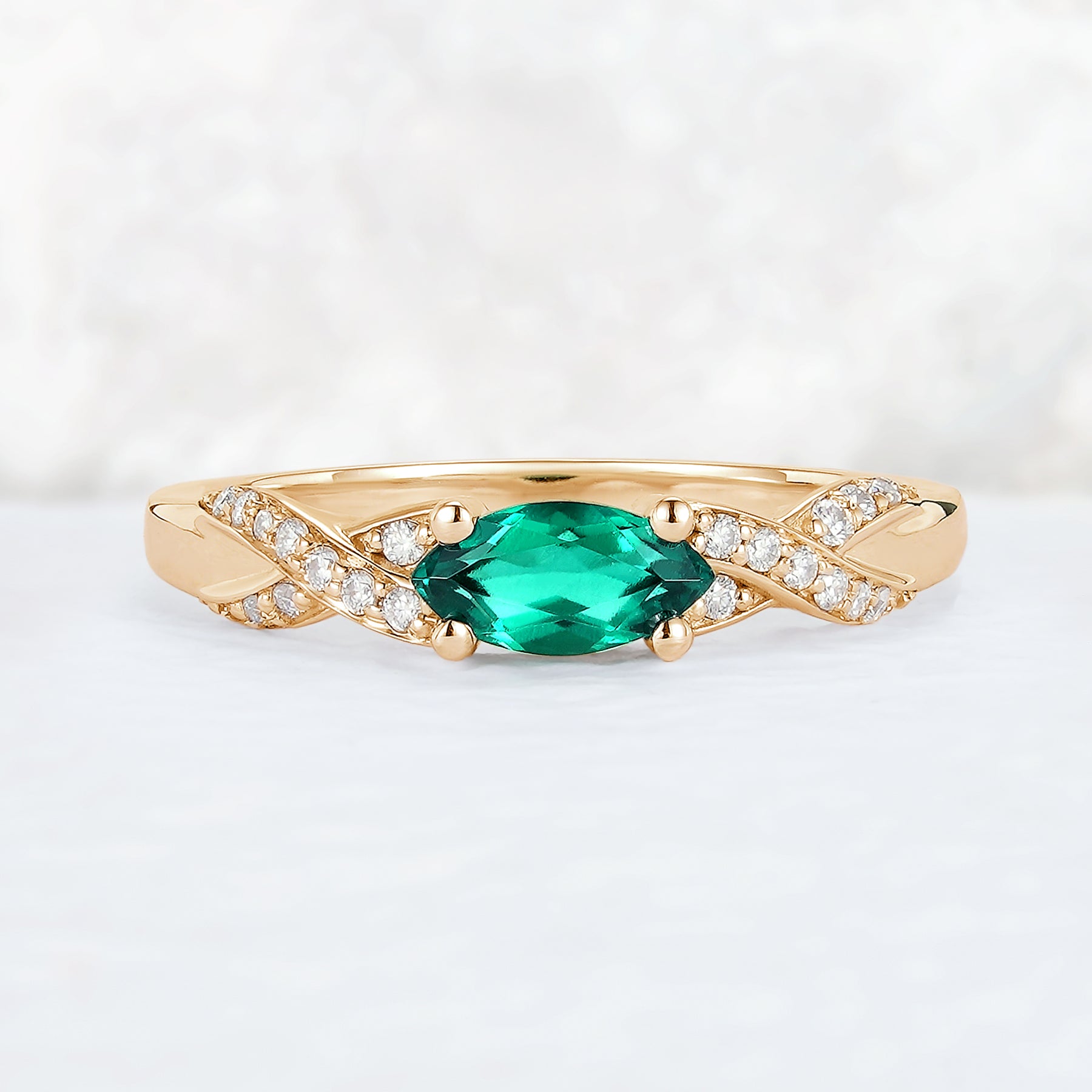 This wedding band features stunning marquise shape emerald in 10k gold. Round shaped moissanite stones add a touch of sparkle to this one-of-a-kind ring, making it the perfect choice for the stylish and discerning bride.