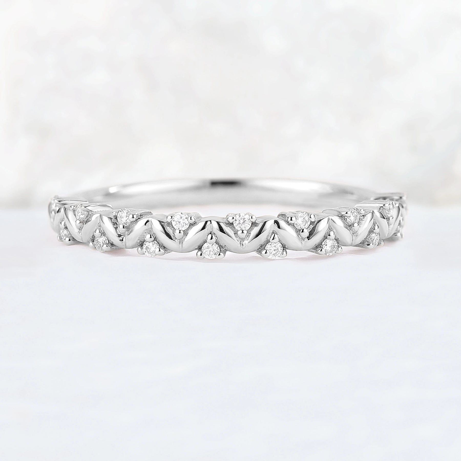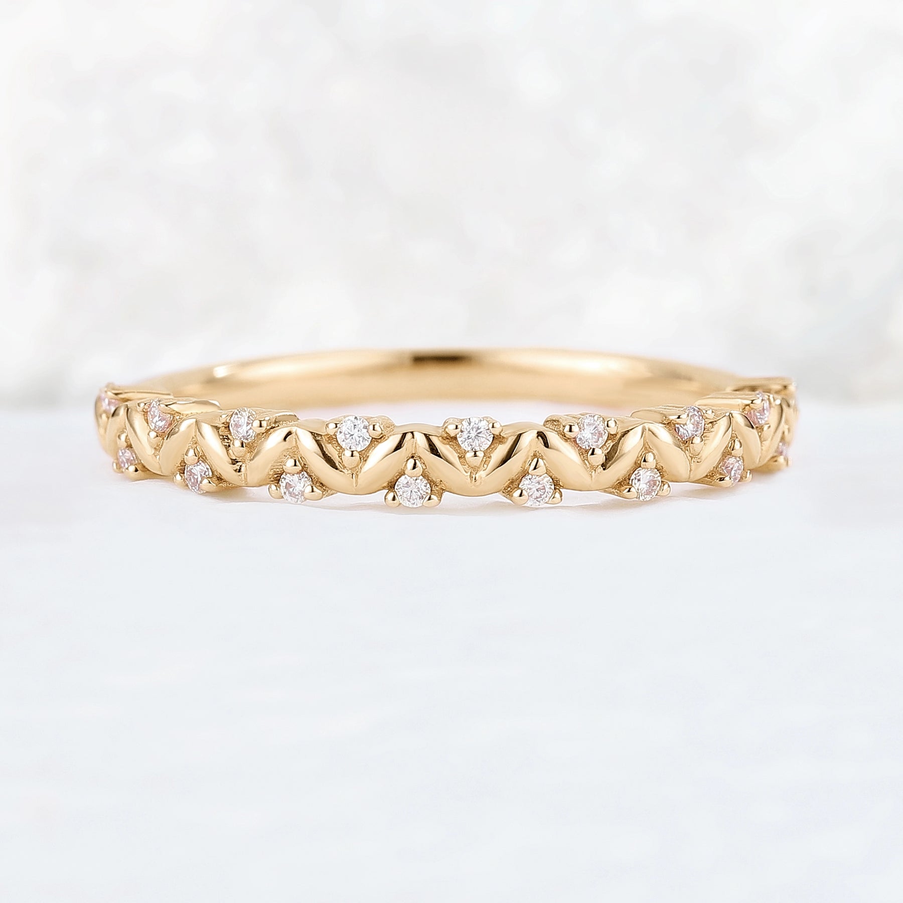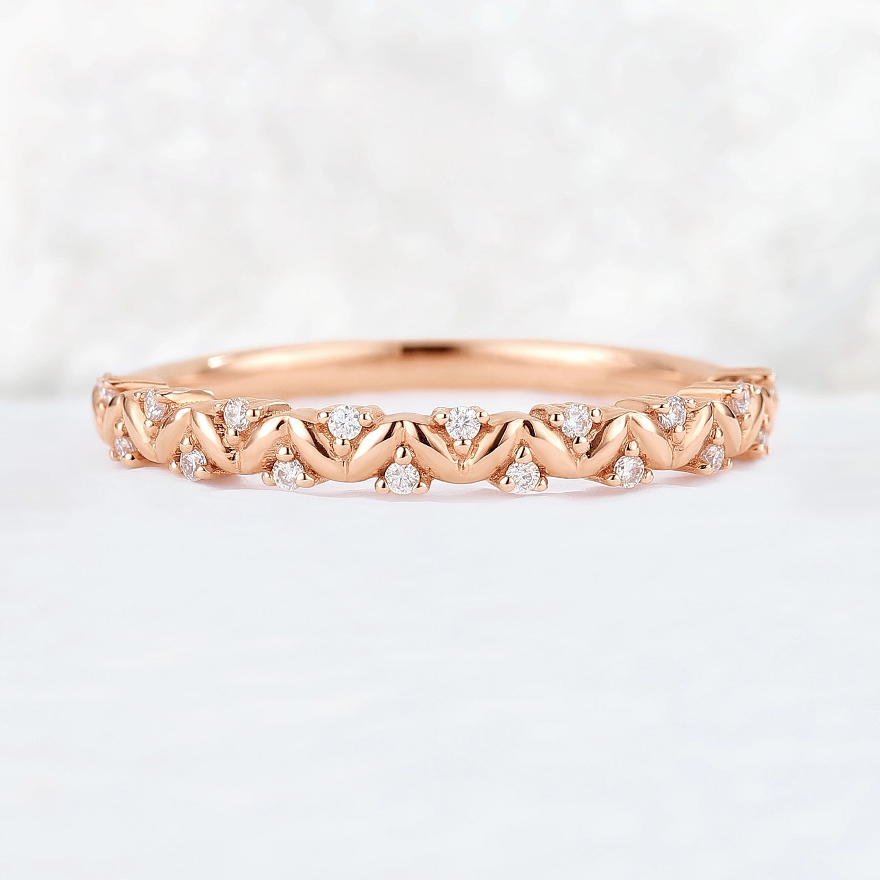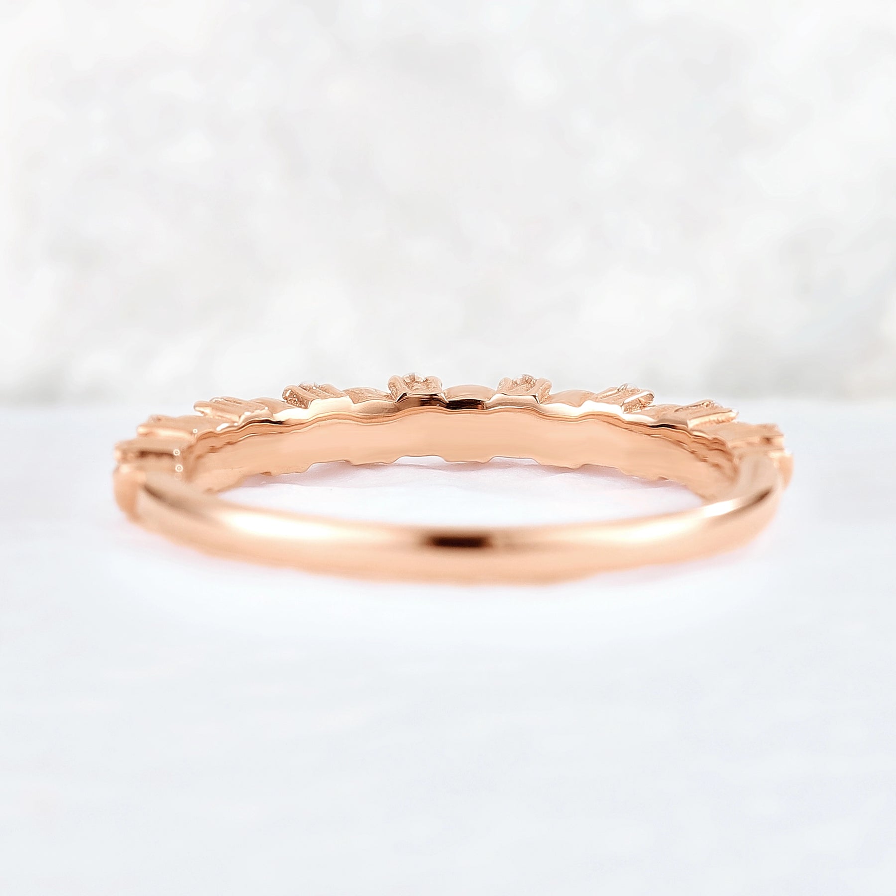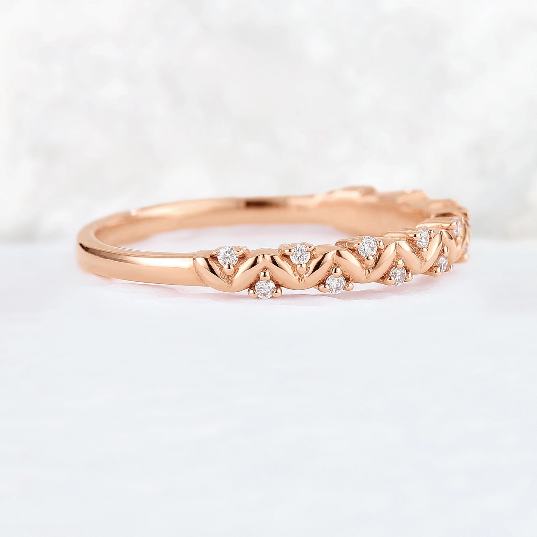 This wedding ring features a stunning round shape moissanite in 14k rose gold.