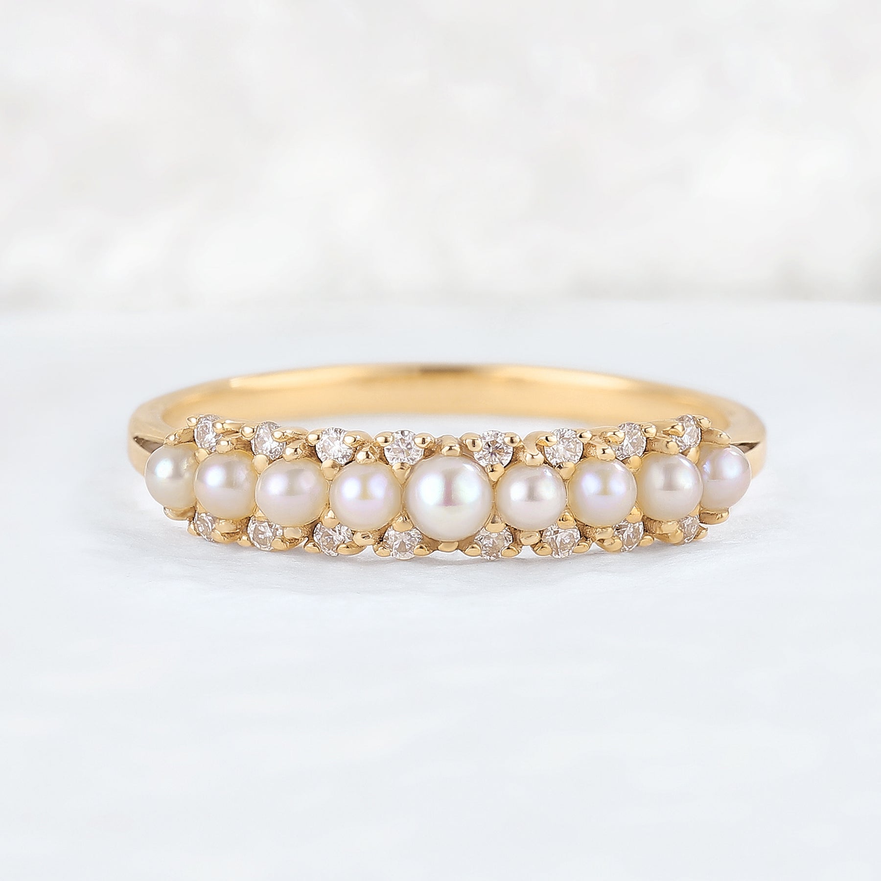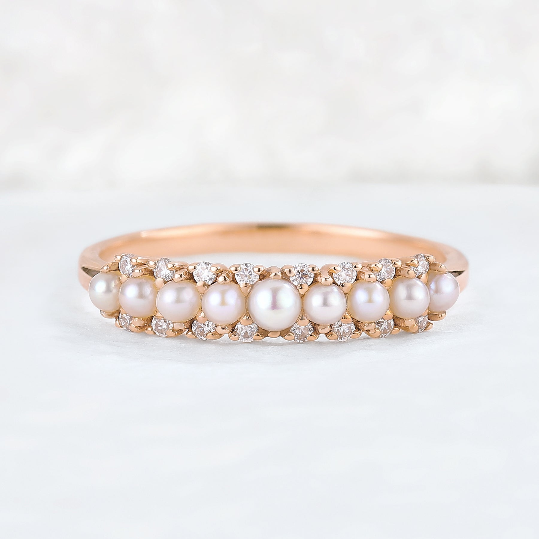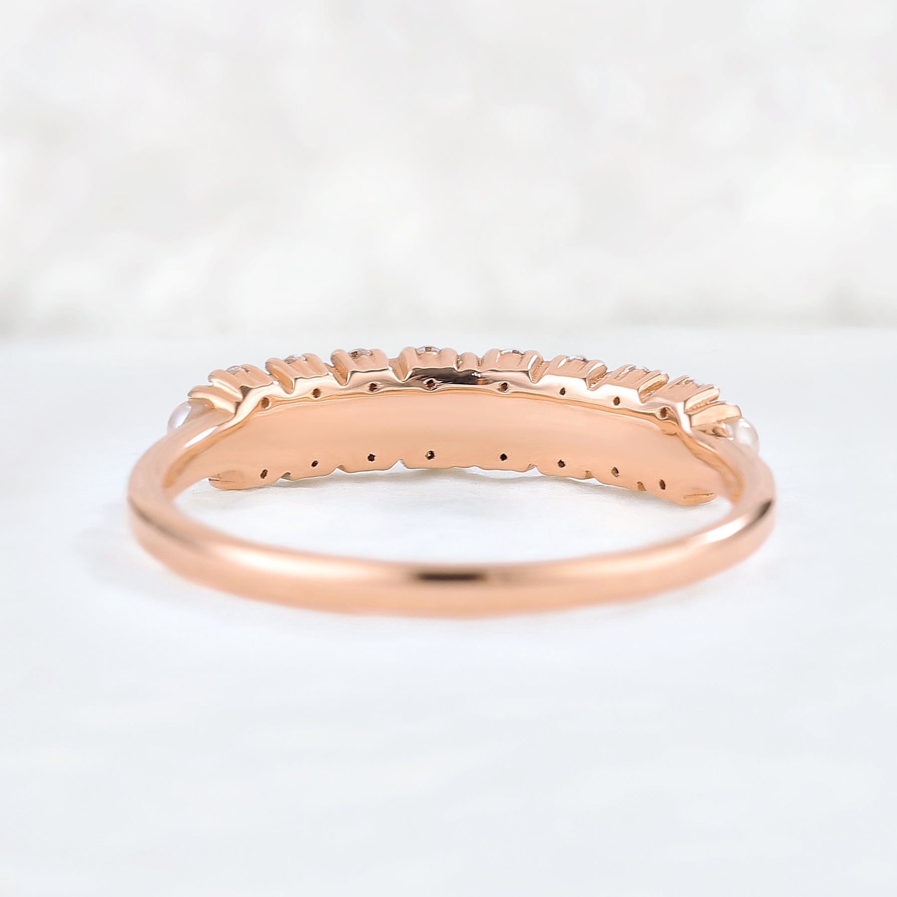 This wedding band features round shape pearl in 14k rose gold.Round cut moissanite add a touch of sparkle to this one-of-a-kind ring, making it the perfect choice for the stylish and discerning bride.