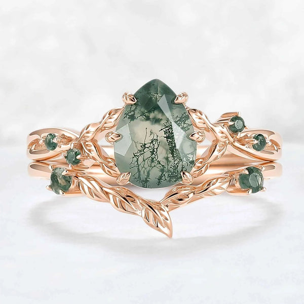 This unique ring features stunning kite shape moss agate in 14k rose gold. Round and marquise cut moissanite add a touch of sparkle to this one-of-a-kind ring, making it the perfect choice for the stylish and discerning bride.