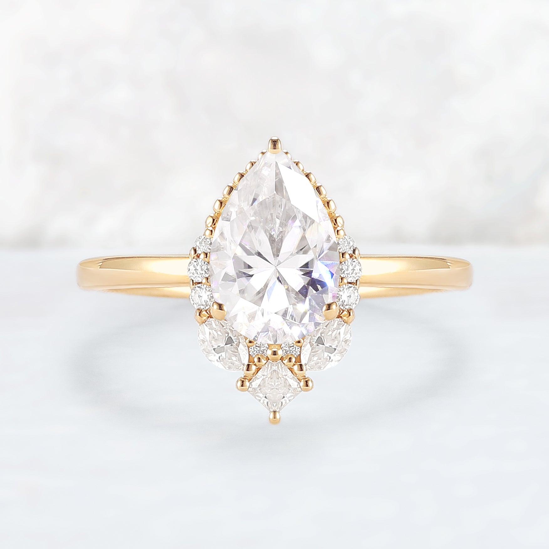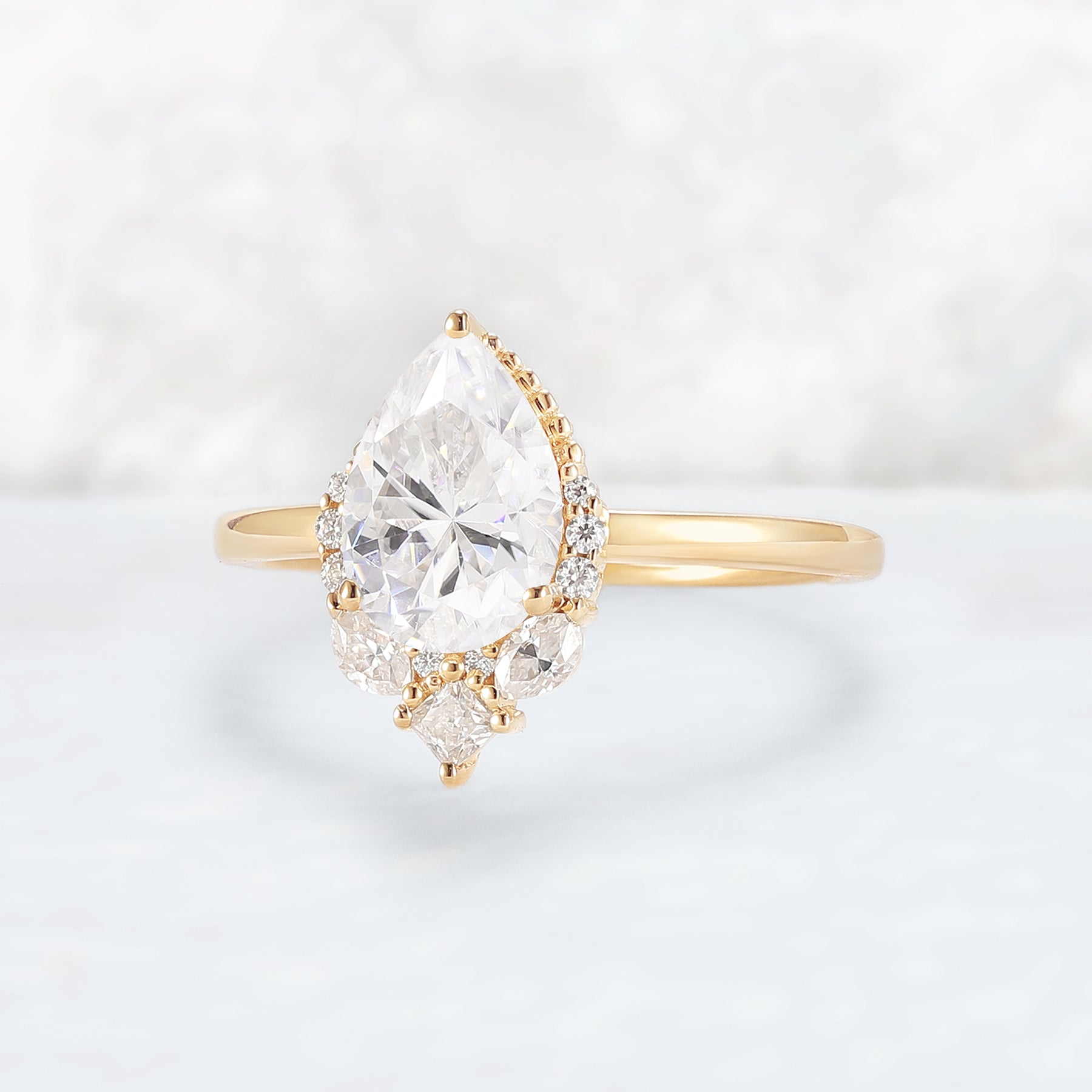 The 10k solid gold Charlotte Ring exudes a quiet elegance—its design feels both intricate and deeply considered. At its heart is a pear-shaped moissanite, gracefully accented by a cascade of princess, marquise, and round-cut moissanites. Each stone is meticulously arranged to draw the eye gently toward the pear’s tip, creating a soft, sweeping silhouette.
