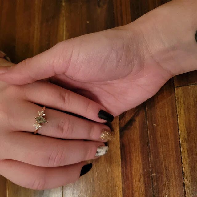 This unique ring features stunning kite shape moss agate in 14k rose gold. Round and marquise cut moissanite add a touch of sparkle to this one-of-a-kind ring, making it the perfect choice for the stylish and discerning bride.