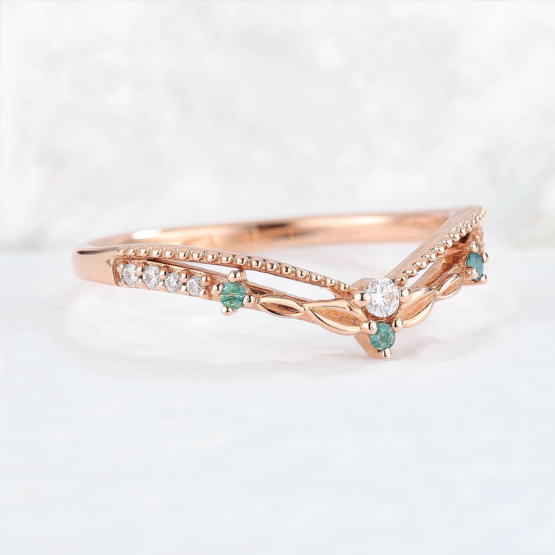 This curved ring features stunning round shape moissanite and moss agate stone in 14k rose gold. Round cut moissanite and moss agate add a touch of sparkle to this one-of-a-kind ring, making it the perfect choice for the stylish and discerning bride.