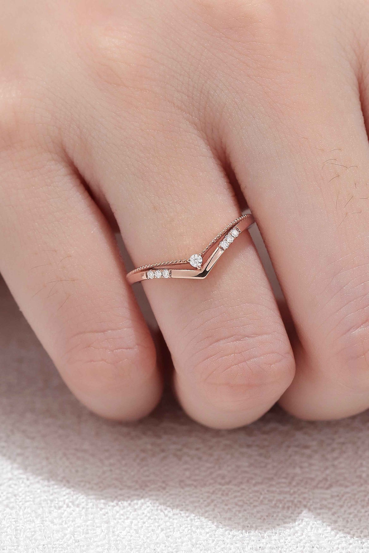 Chevron Round Moissanite 14k Rose Gold Stacking Ring